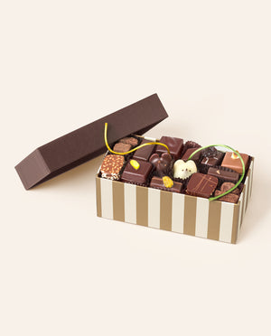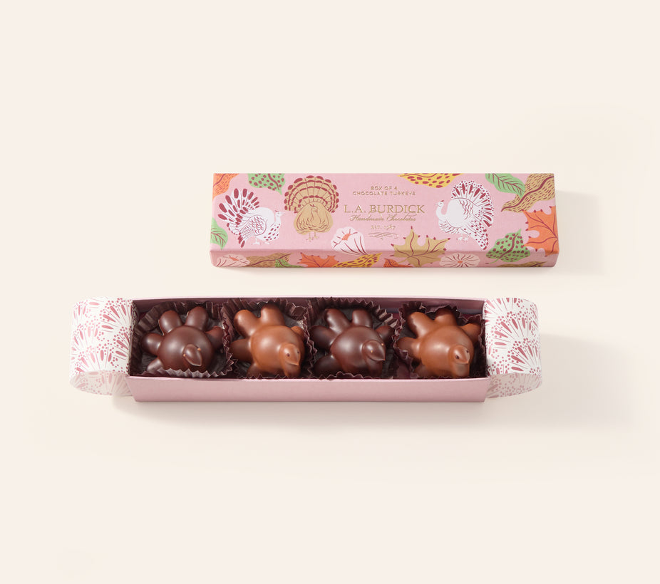 Milk Chocolate Turkey: Hand-piped with dark chocolate ganache blended with pecans, chestnut, and a touch of bourbon, accented with toasted almonds, and enrobed in milk chocolate