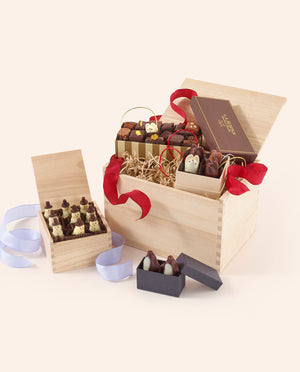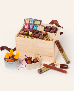 Delight your loved ones with our premium chocolate gift baskets and elegant wooden chocolate crates, thoughtfully curated with our bestselling confections and ready for gifting. Our luxury chocolate gift sets feature our signature wooden boxes and cotton canvas totes filled with our most popular chocolates, creating memorable presents perfect for any occasion. Each chocolate gift set is carefully arranged with a selection of our signature items, from artisan bonbon assortments to Chocolate Mice and Penguins, ensuring recipients experience the full range of our craftsmanship. Our wooden chocolate crates offer a rustic elegance that doubles as a keepsake, while our gift baskets provide immediate impact for birthdays, holidays, and corporate gifting. Whether you need chocolate gifts for clients, anniversary presents, or thank you gifts, our ready-to-ship chocolate collections simplify the process. Our curated collections showcase why we’re a preferred choice for chocolate gifting. Share the delight of L.A. Burdick with a gift basket certain to leave a lasting impression.