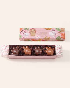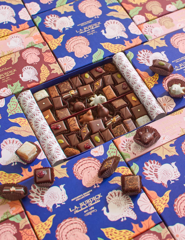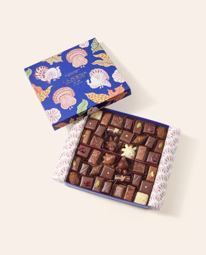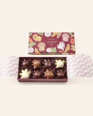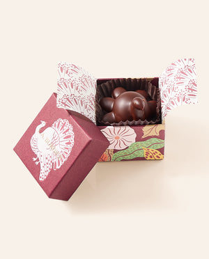 Celebrate Thanksgiving with our festive chocolate collection featuring seasonal fall-flavored bonbons and charming Chocolate Turkeys that capture the warmth of autumn traditions. Our Thanksgiving chocolates showcase rich fall flavors including apple, chai, and cranberry. Our Chocolate Turkeys add whimsical elegance to Thanksgiving tables, meticulously crafted from premium chocolate with delightful details that make them perfect centerpieces or gifts. These autumn chocolate confections combine traditional holiday flavors with our signature craftsmanship, creating memorable treats. Perfect for Thanksgiving hostess gifts, fall party favors, or sharing with loved ones during a season of gratitude, our seasonal chocolate collection celebrates harvest flavors. Whether you're seeking unique Thanksgiving desserts, fall-themed chocolate selections, or want to add artisanal touches to your holiday table, our autumn collection delivers seasonal sophistication. Our Thanksgiving chocolates make thoughtful expressions of thanks for friends, family, and hosts while bringing the cozy flavors of fall into every bite.