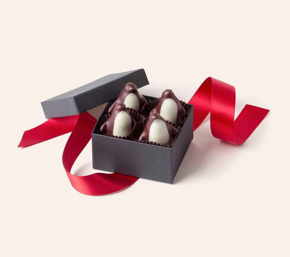 The toasted almond wings of our Chocolate Penguin welcome everyone to the party. Chocolate Penguins are handcrafted from whipped dark chocolate ganache with a hint of fresh lemon.