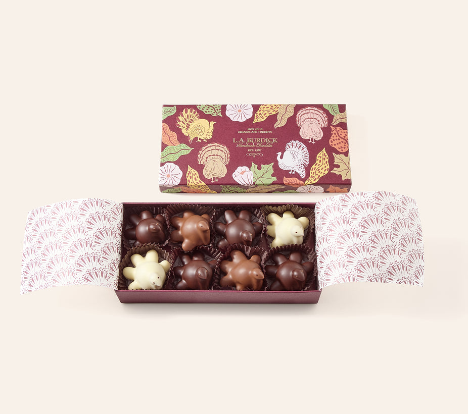 White Chocolate Turkey Hand-piped with dark chocolate ganache with freshly pressed New England apple cider, accented with toasted almonds, and enrobed in milk in white chocolate