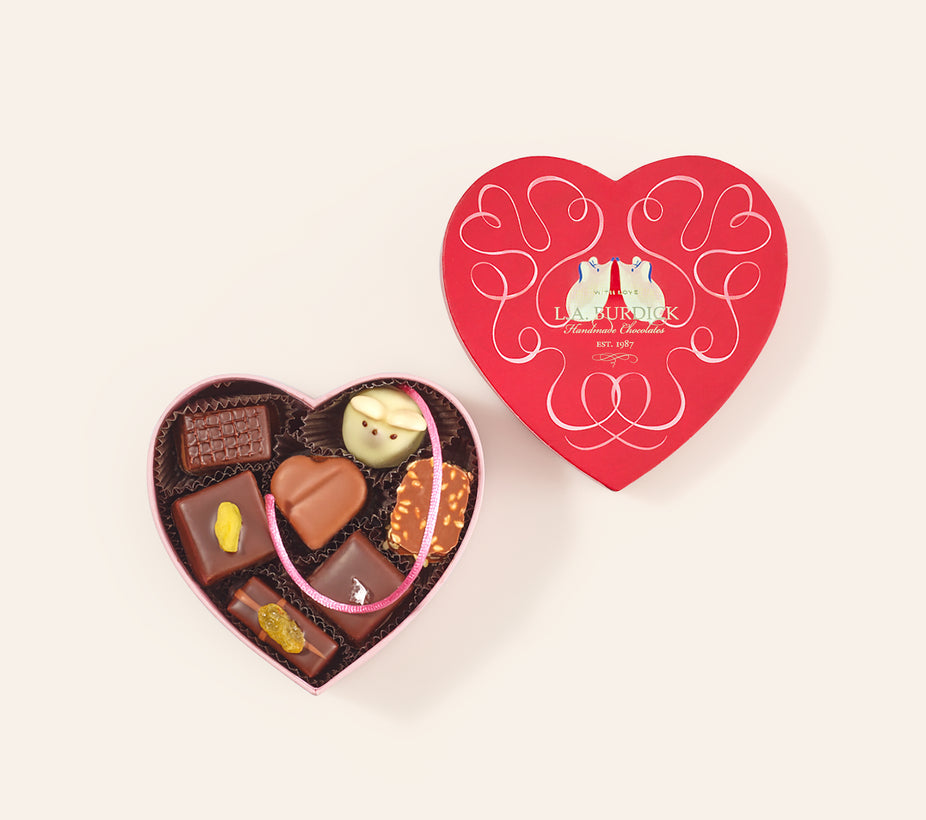 This delightful heart-shaped gift box for Valentine's Day is certain to charm a loved one. Each piece, including our beloved Chocolate Mouse, is crafted individually and intricately by hand.