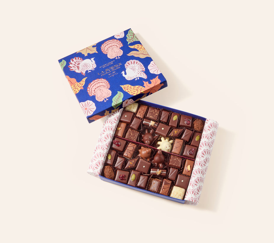 The last ripening plums and figs on the trees. Crisp orchard apples. freshly pressed cider. The season’s first citrus. The scent of warming spices in the air. Each handcrafted chocolate bonbon in this assortment celebrates an autumnal delight, gathered around four hand-piped Chocolate Turkeys at the center.