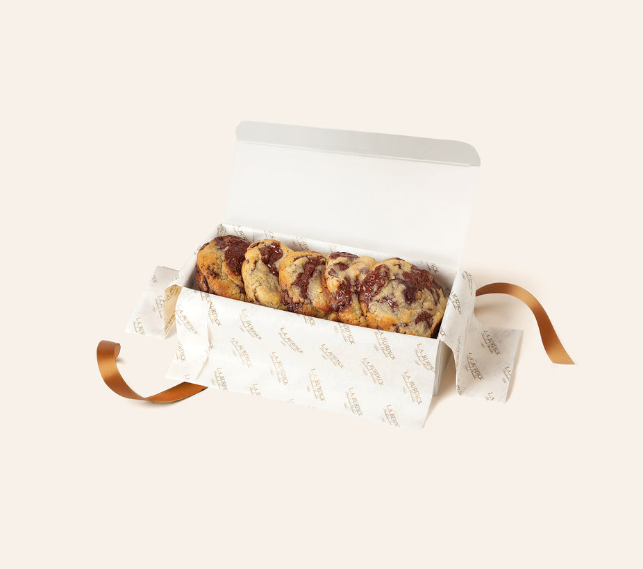 Our much-loved Burdick Cookie features a rich and moist dark chocolate center, dark chocolate chips, crunchy walnuts, and a touch of fresh vanilla bean. Five cookies, baked fresh the same day they ship, come nestled inside a gift box tied with a ribbon.