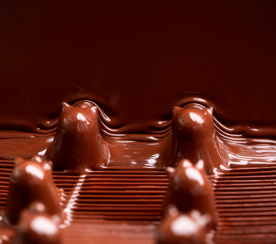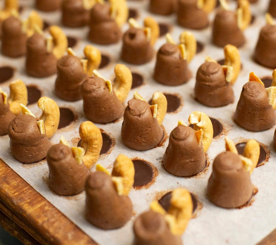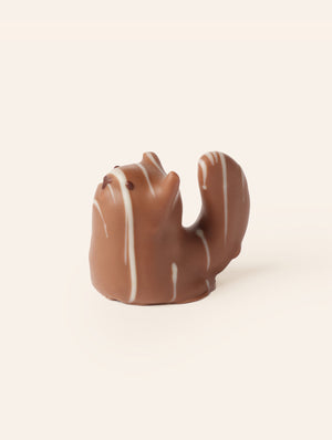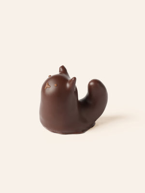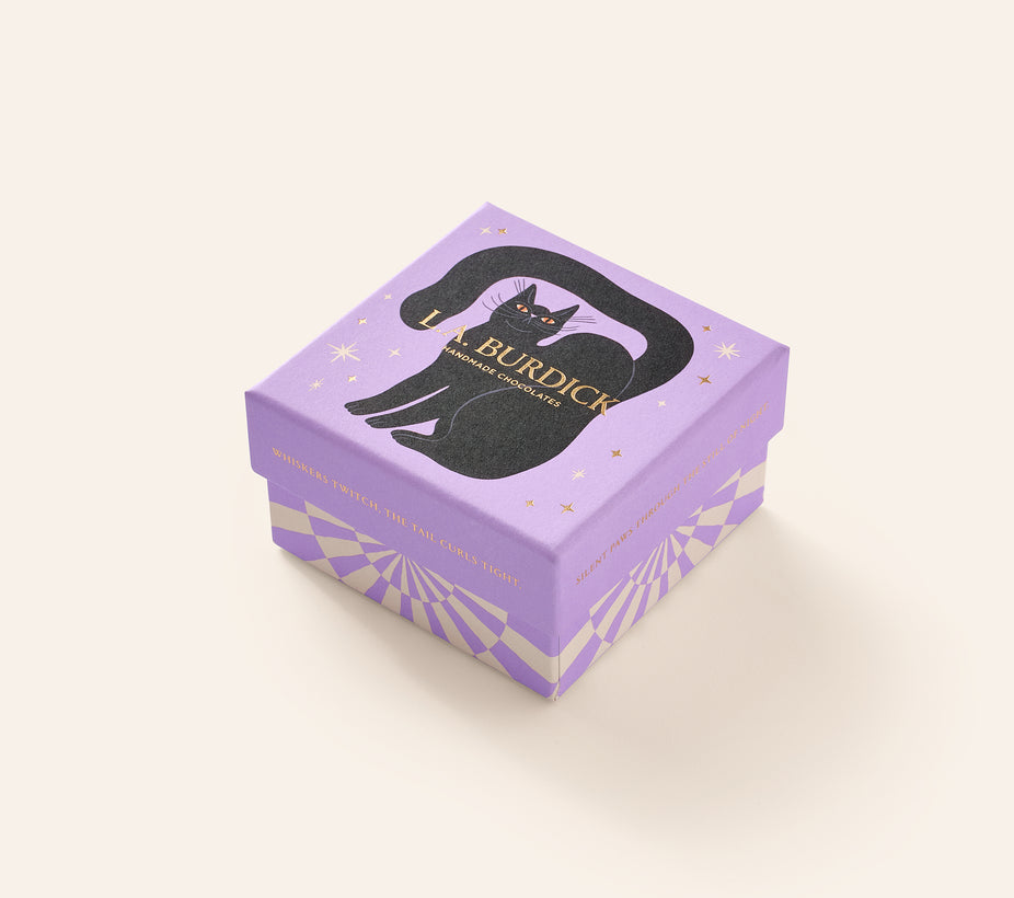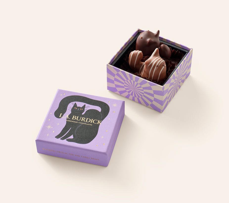 A favor box of 2 furtive felines: our spooky Black Cat paired with a mischievous Tabby. New this year, our Tabby Cat is hand-piped with caramelized cashew and hazelnut ganache then enrobed in milk chocolate and adorned with hand-painted stripes. The playful companion to our dark chocolate and morello cherry Black Cat.