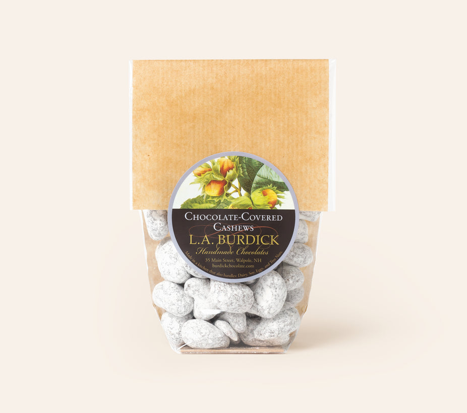 Creamy roasted cashews are coated with our velvety dark chocolate and complemented with a dusting of powdered sugar.