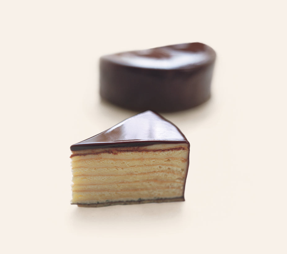 Traditional German "Herrentorte." 11 layers of sponge cake and lemon cream are glazed in our signature dark chocolate.