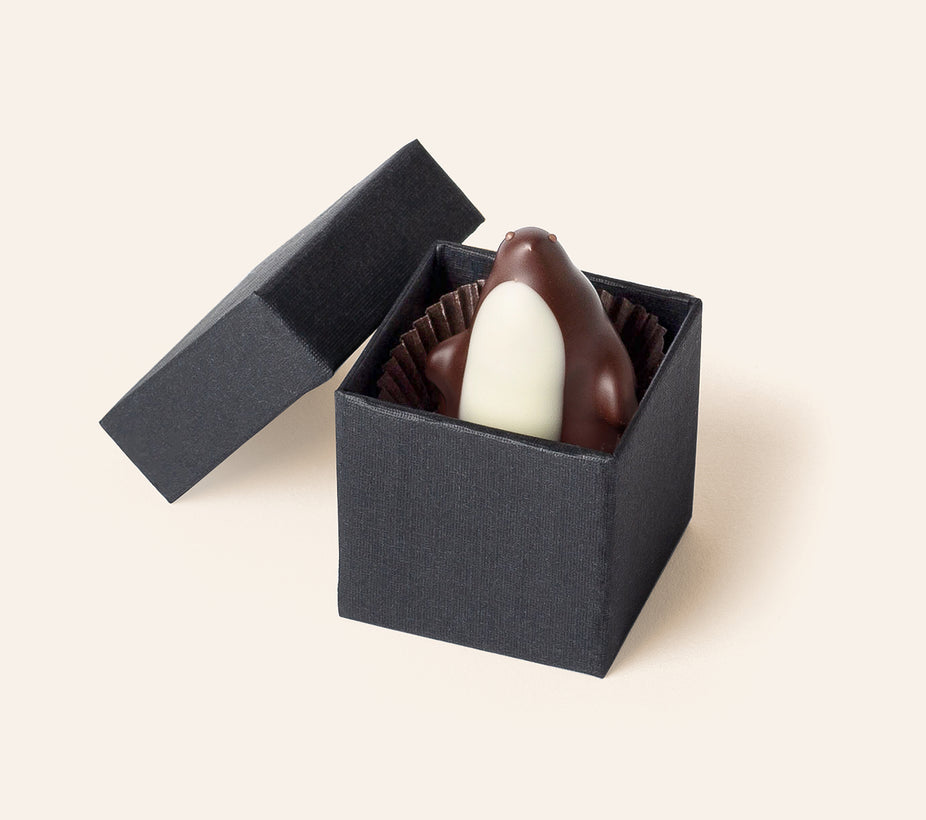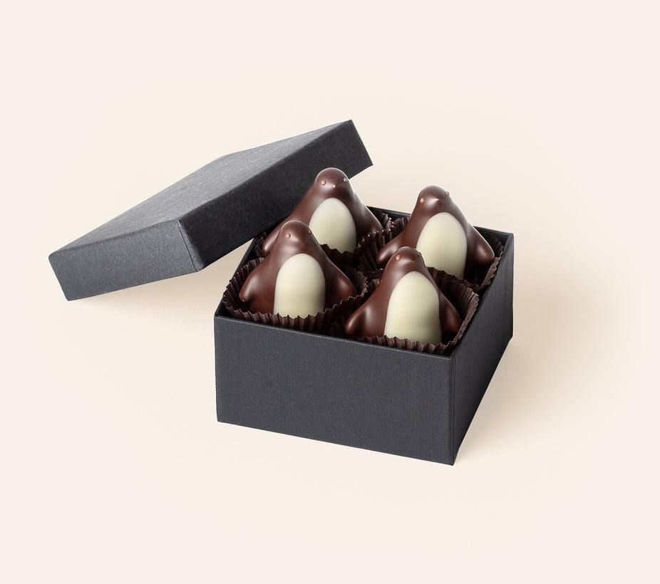 The Chocolate Penguin combines whimsy and delicious flavor in one delightful novelty chocolate. Each Penguin is hand-piped from a whipped dark chocolate ganache with a hint of fresh lemon, and has toasted almond wings. Penguins arrive in a gift box adorned with ribbon.