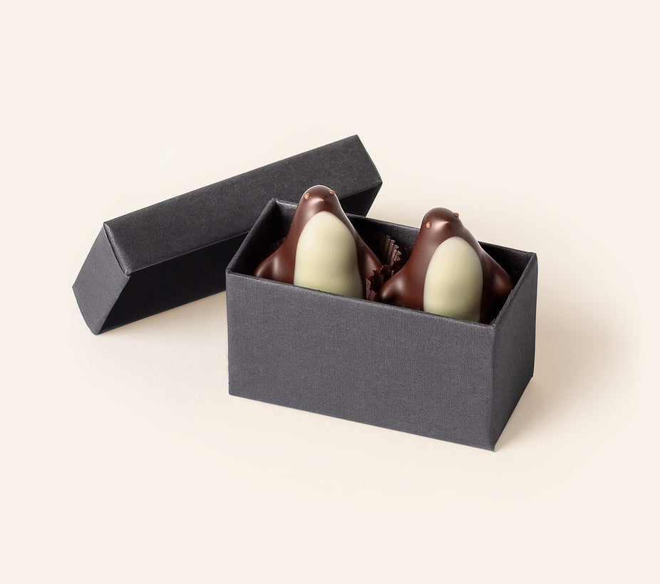 The Chocolate Penguin combines whimsy and delicious flavor in one delightful novelty chocolate. Each Penguin is hand-piped from a whipped dark chocolate ganache with a hint of fresh lemon, and has toasted almond wings. Penguins arrive in a gift box adorned with ribbon.