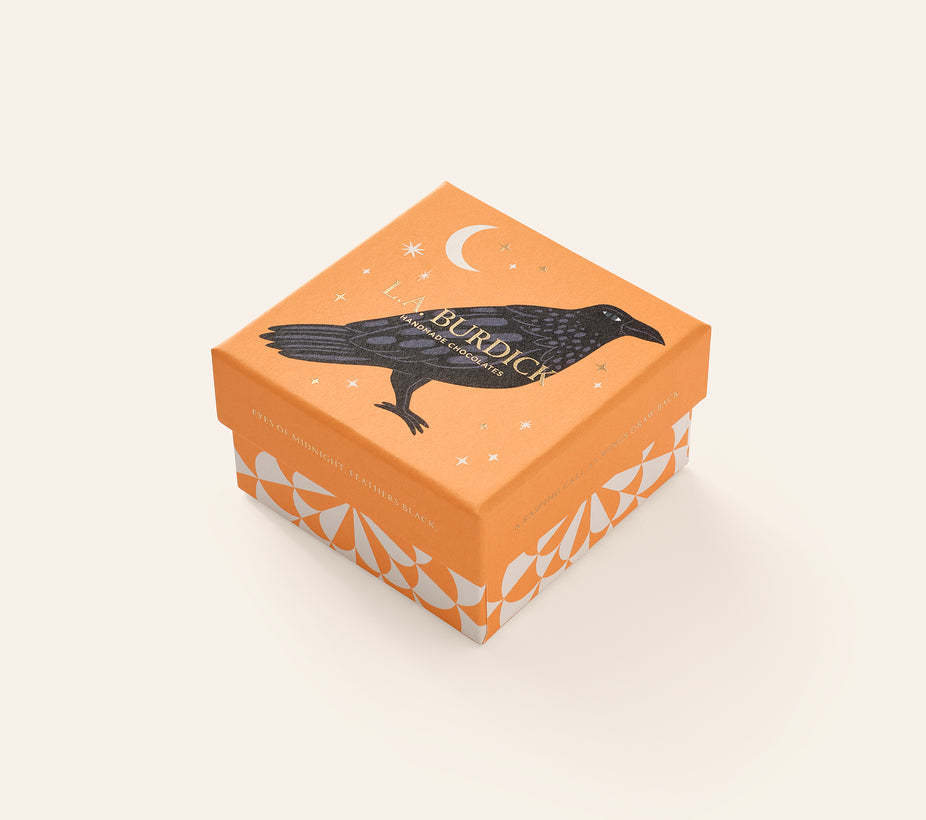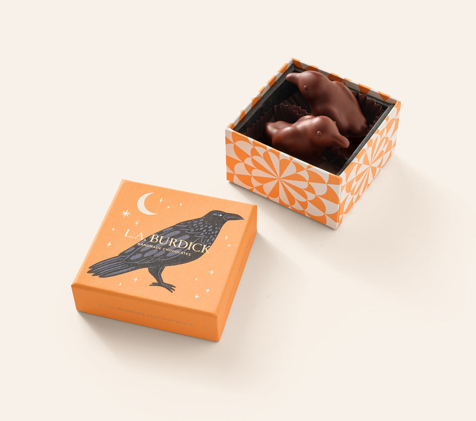 This elegant favor box contains a pair of stately handcrafted Chocolate Ravens with a London Fog-inspired ganache made with Earl Grey tea, Madagascar vanilla beans, and French lavender. Perfect as a slightly spooky Halloween treat or a thoughtful seasonal gift.