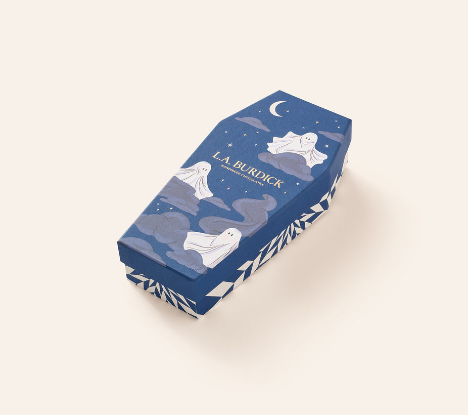 Unearth a coffin’s worth of autumnally inspired bonbons. Our head chocolatier’s favorite, the Coffin Assortment is deeply sophisticated and darkly enchanting. Gift-ready for your favorite Halloween reveler, a pull of the satin ribbon and a crack of the lid reveal a crescent moon, mini ghosts, a spooky-eyed mouse, the flavors of cranberry, Calvados, pecans, pumpkin and more, replete with spicy ganaches and spiky garnishes.