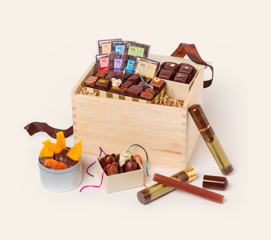 Made for chocolate lovers, this unique gift box is perfect for expressing gratitude or fêting the holidays, a birthday, anniversary, professional achievement, and other milestones. Includes 1/4 lb. Everyday Chocolate Assortment, box of 4 Chocolate Mice, box of Chocolate-Covered Marzipan, Single Source Dark Chocolate Bar Sampler Set, 2 Chocolate Cigars, and Chocolate-Dipped Mangoes & Apricots.