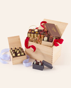 Indulge in the epitome of chocolate craftsmanship with our curated selection of bestsellers, perfect for both newcomers to the world of L.A. Burdick and devoted aficionados alike. Our 1 lb Everyday Assortment, Signature Chocolate Mice, Chocolate Penguins, and Burdick Cookies come nestled inside a wooden gift crate finished by hand with a beautiful ribbon and our signature gold wax.