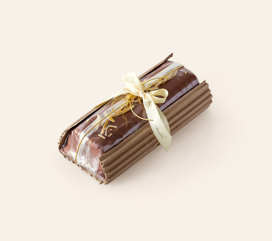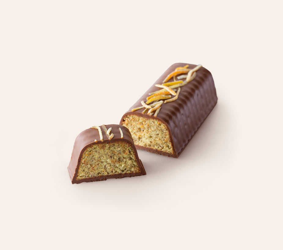 A moist flourless cake made with ground hazelnuts and fresh oranges is enrobed in a generous layer of hazelnut gianduja and sprinkled with candied orange peels.