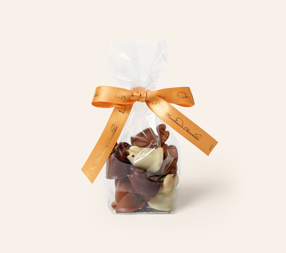 Individually handcrafted, no two of our Chocolate Whimsicals are exactly alike, sometimes bearing small visual imperfections that reflect their handmade nature. These chocolates have their own special character and are just as delightful to eat. Each bag contains approximately nine assorted pieces, which may include Chocolate Mice, Penguins, Elephants, Bees, or Ducks, among others. Available for a limited time only, through March 27.