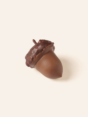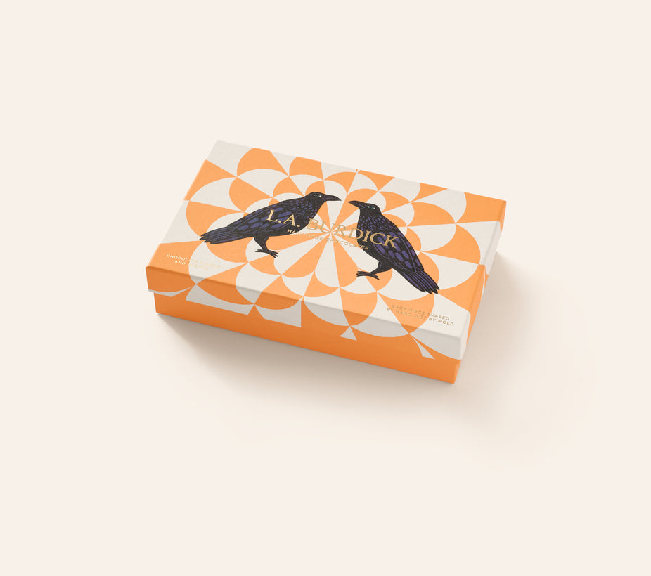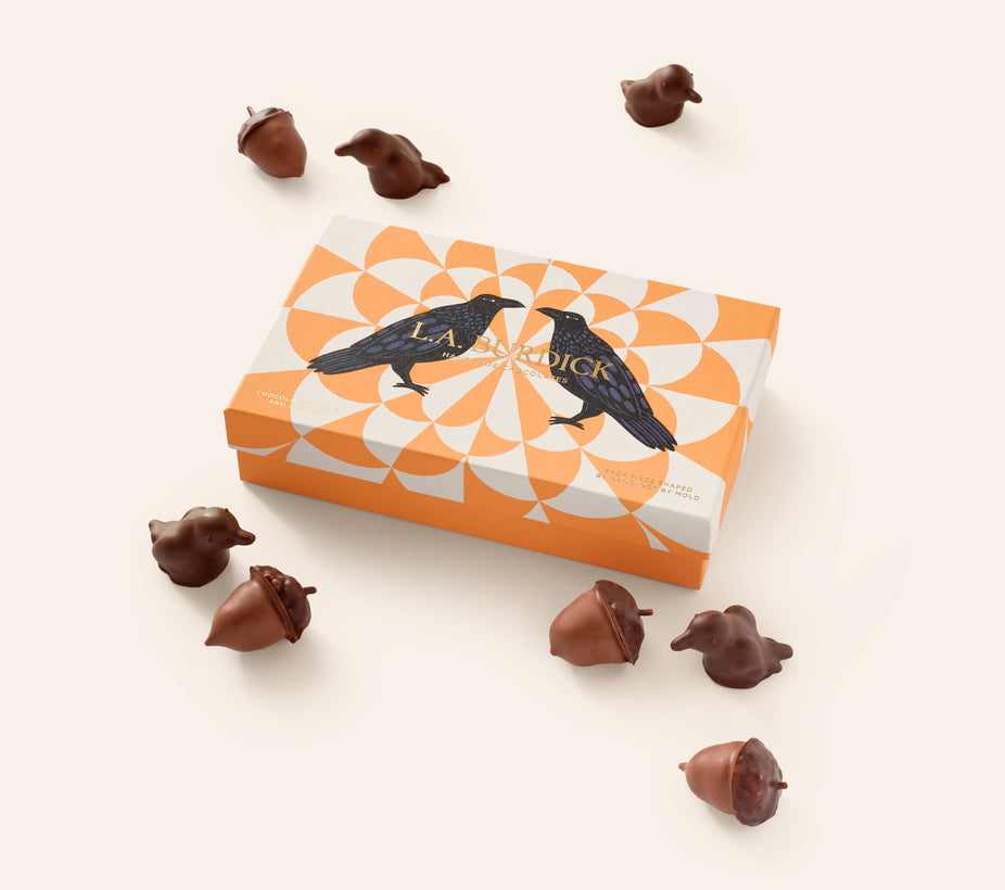 Our newest Halloween creature presented in a gorgeously illustrated gift box: Dark Chocolate Raven. Inspired by the superstition of the Tower of London ravens and accompanied by their cache of Acorns, these stately sentinels are handcrafted from London Fog-style dark chocolate ganache infused with Earl Grey tea and lavender and accented with toasted almonds. Paired with them are four woodland-inspired Chocolate Acorns featuring pine honey and a hint of fresh tarragon and finished with crispy hazelnut chocolate caps.