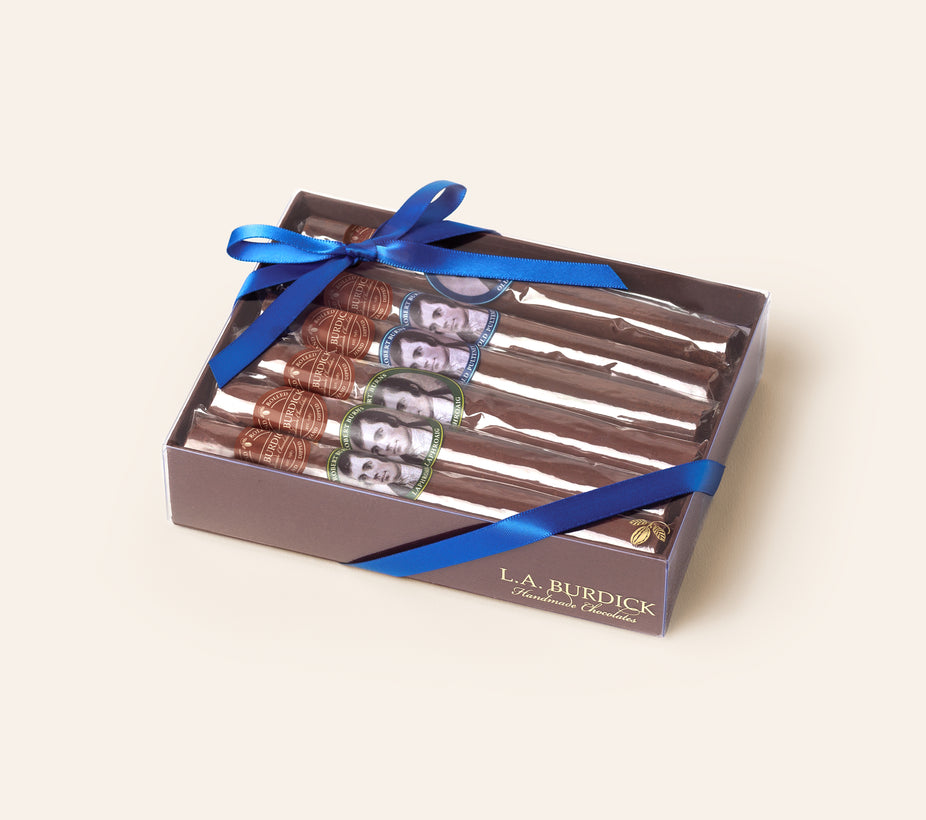 Dark chocolate and single malt Scotch whisky come together to create these exquisite gourmet chocolate cigars. Dark chocolate ganache blended with Scotch is hand-rolled into the shape of a cigar to enjoy in two distinctive flavors: 10-year-old Laphroaig and 12-year-old Old Pulteney. Includes 6 pieces.