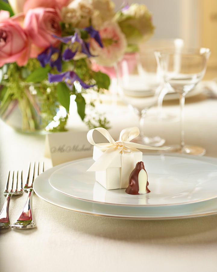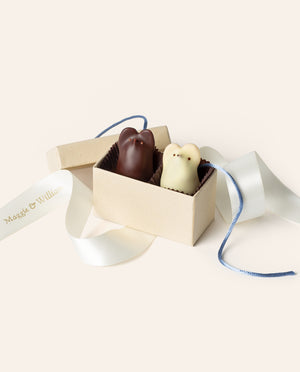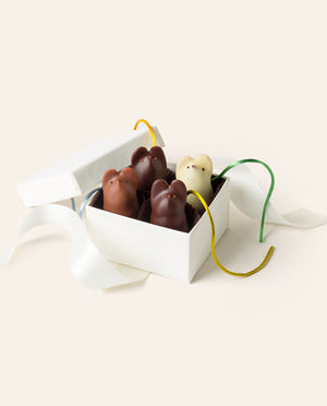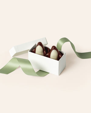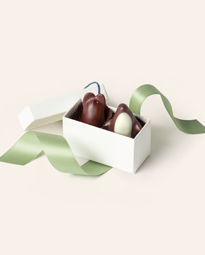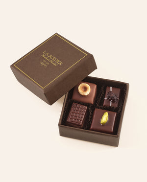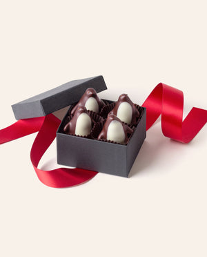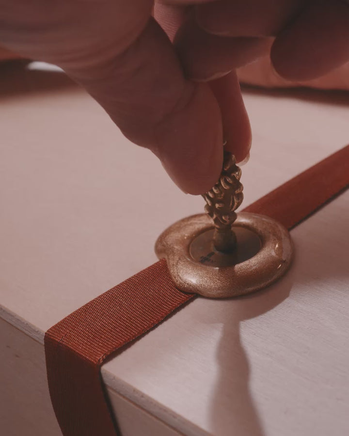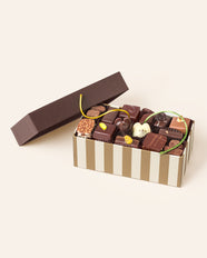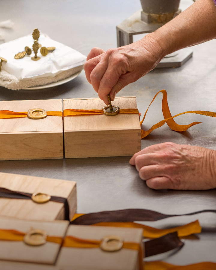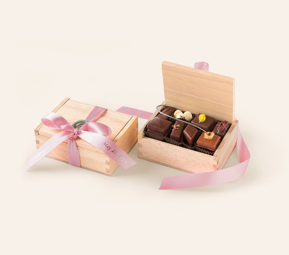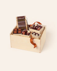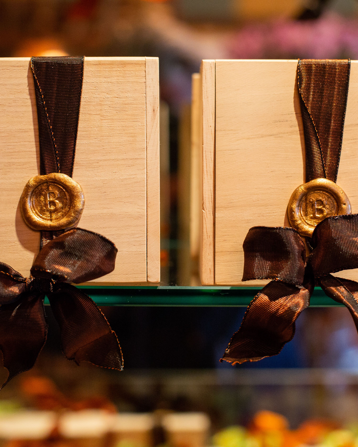 Perfect for special occasions of all kinds, an elegant wooden box hand-stamped with a wax seal and hand-tied with a ribbon holds an exquisite array of handcrafted chocolates.