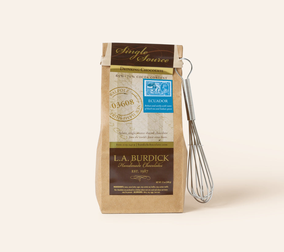 Explore the unique terroir of Ecuador with this delicious, complex drinking chocolate. It is robust and earthy with notes of black tea, mint, and Indian spices. Perfect hot or served over ice. 70–72% cocoa content.